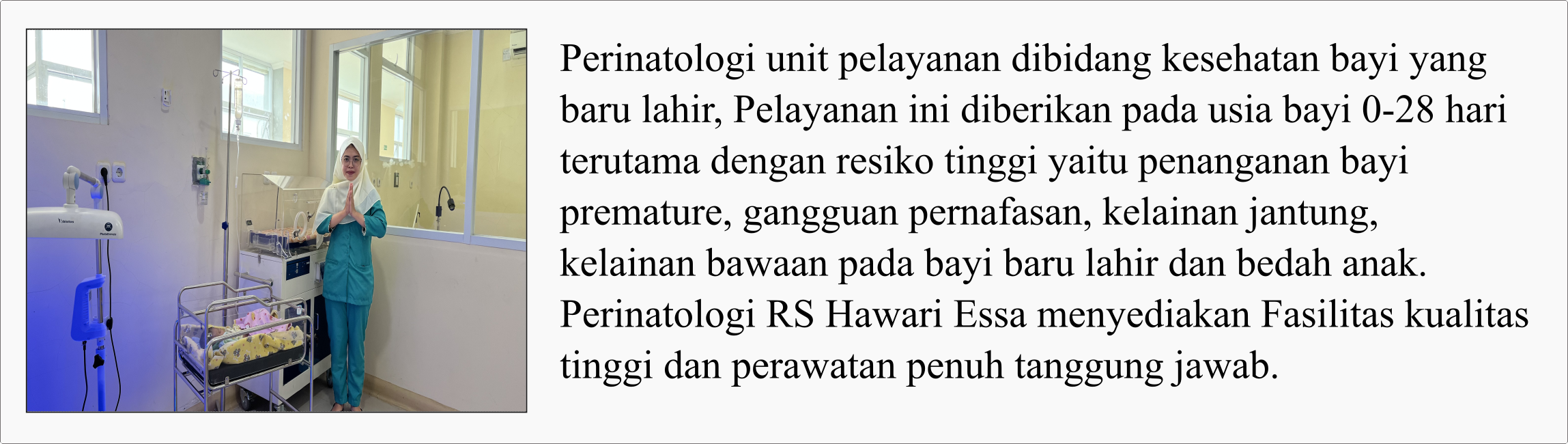 Poliklinik RS Hawari Essa mempunyai beberapa Poli Spesialis di antaranya Poli Obgyn, Poli Anak, Poli Gigi, Poli Saraf, Poli Bedah Poli Penyakit Dalam, Poli Anestesi, Poli Mata, Serta terdapat Poli Umum.